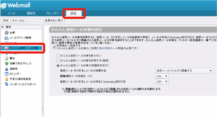設定変更は、左メニュー「かんたん迷惑メール対策」、上段タブ「設定」から行うことができます。