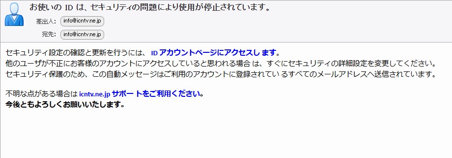admin@icntv.ne.jp等の存在しないアドレス、お客様のアドレスを装ったアドレスでメールが届くといったご報告がございます。