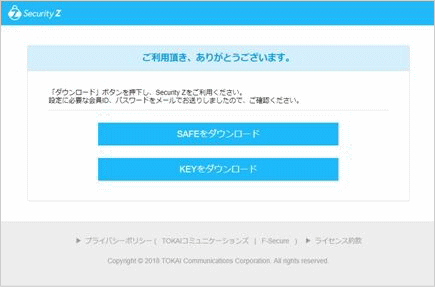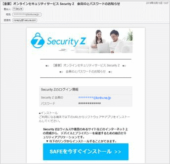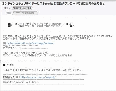 | 4. | 製品選択後、下記のダウンロードメール(通常、数分以内)が届きます。 件名 : 【重要】オンラインセキュリティサービス Security Z 会員IDとパスワードのお知らせ 送信元メールアドレス : safeavenue@f-secure.com |