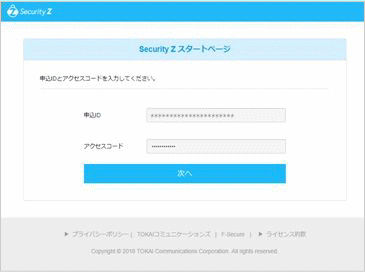 | 3. | 通知メールに記載のURLを開くと、Security Zスタートページが表示されます。 申込ID、アクセスコードの入力が求められますので通知メールに記載の内容に従い、ご入力いただき、「次へ」を押してください。 次のページに表示された製品を選択してください。 |