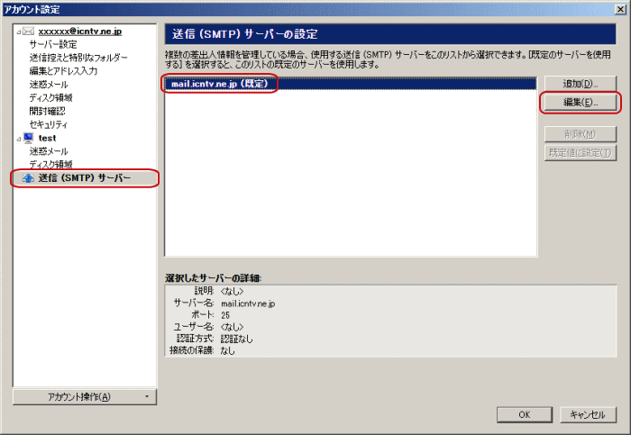 ■【送信(SMTPサーバー)】をクリックし、【mail.icntv.ne.jp】を選択し、編集(E)をクリックします。