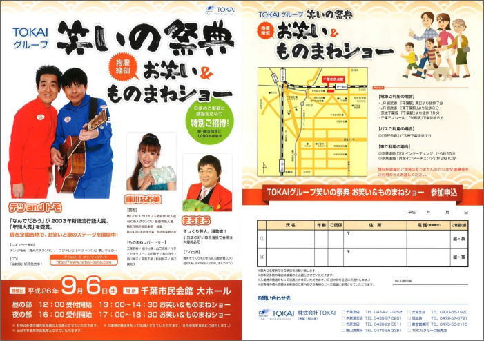 | ◆ | 開催日 | : | 平成26年9月6日(土) ・昼の部 12:00受付開始 13:00~14:30お笑い&ものまねショー ・夜の部 16:00受付開始 17:00~18:30お笑い&ものまねショー |